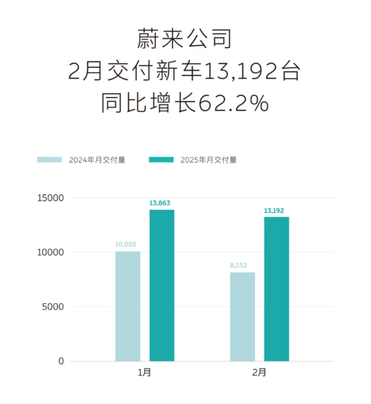 蔚来公司2月交付新车13192台,同比增长62.2% 蔚来公司2月交付新车13192台,同比增长62.2%
